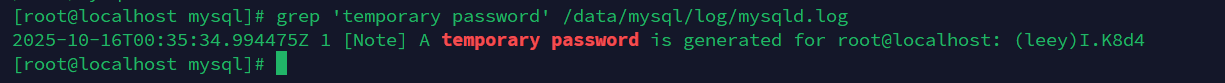 grep 'temporary password' /data/mysql/log/mysqld.log